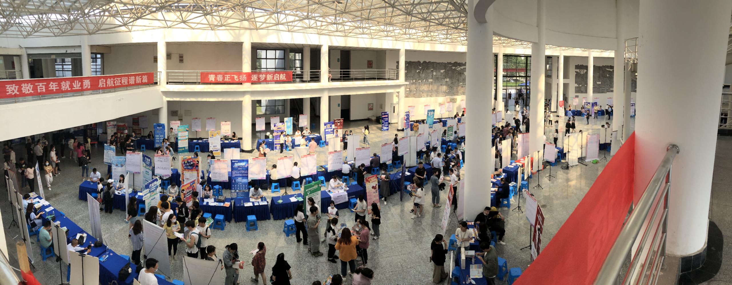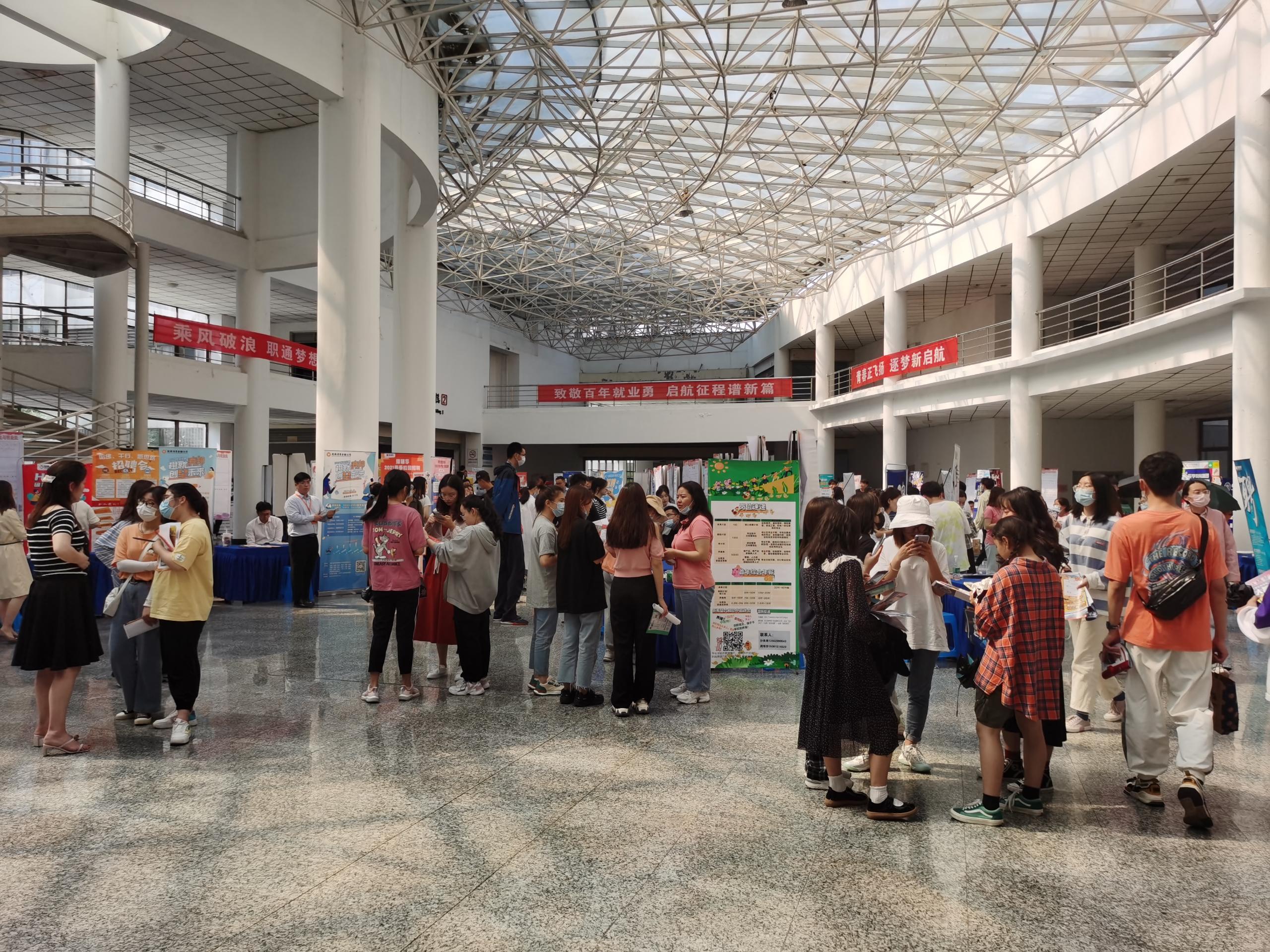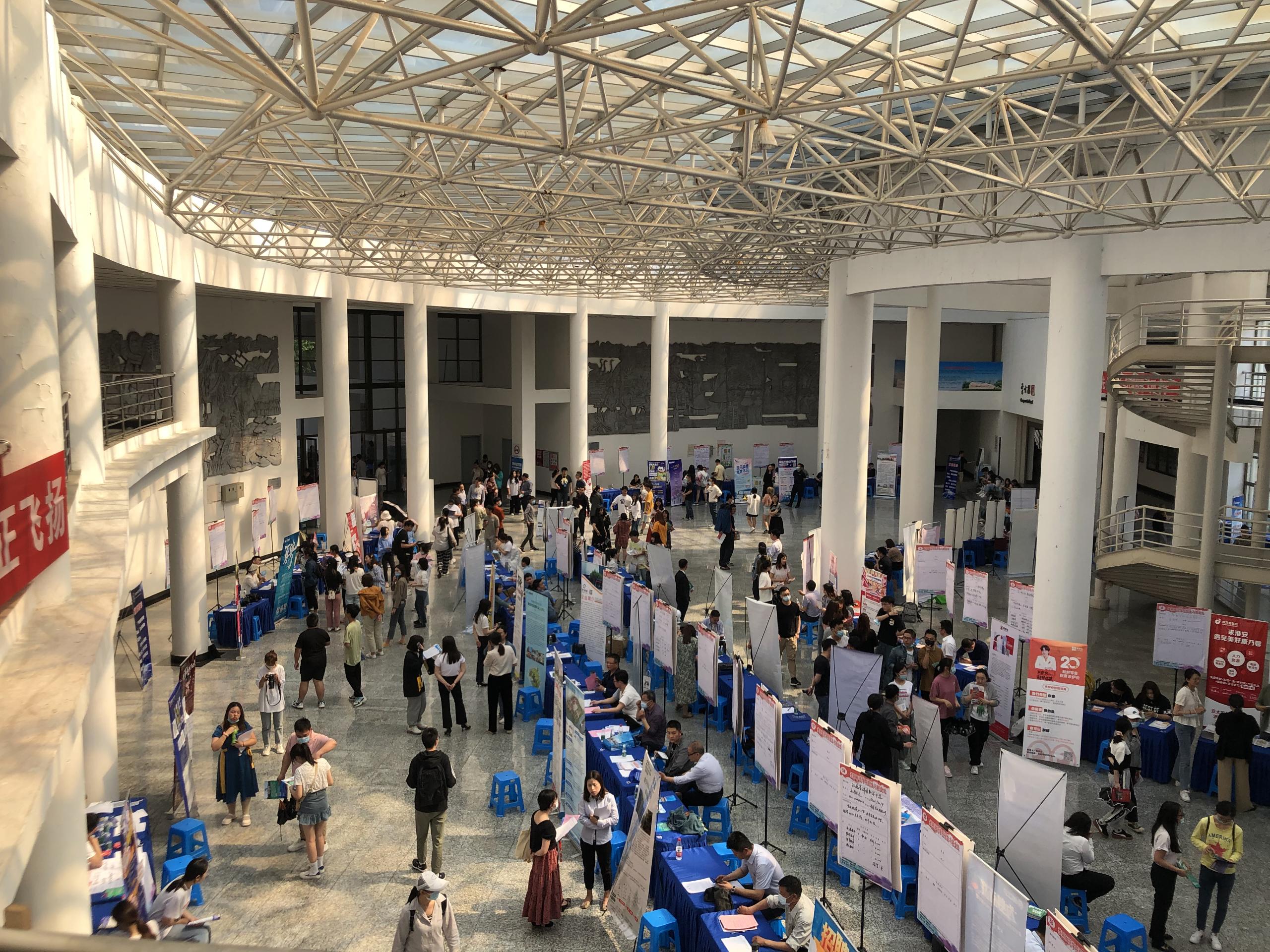 2021年5月22日下午,淮陰師范學(xué)院于長江路校區(qū)崇文樓大廳舉行。參會的120余家單位提供9017個就業(yè)崗位,吸引5000多名畢業(yè)生前來咨詢,部分大三同學(xué)入場觀摩?;窗踩瞬艧峋€提供全方位服務(wù)支持。招聘會取得圓滿成功。