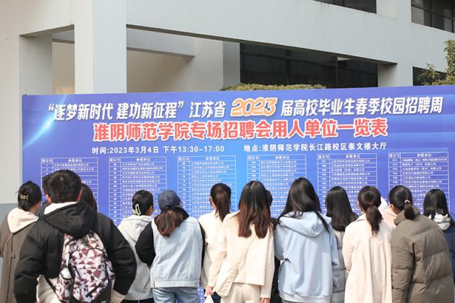 3月4日,“逐夢新時代 建功新征程”江蘇省2023屆高校畢業(yè)生春季校園招聘周淮陰師范學(xué)院專場招聘活動在長江路校區(qū)崇文樓大廳舉行。220余家企業(yè)及近4000余名畢業(yè)生參加活動。
