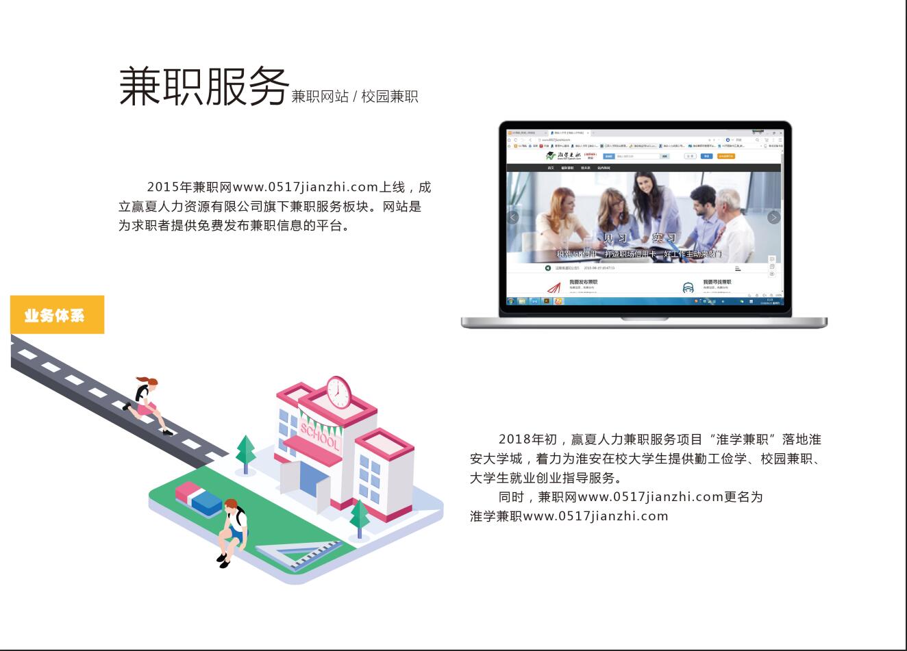 2018年初,贏夏人力兼職服務(wù)項(xiàng)目“淮學(xué)兼職”落地淮安大學(xué)城,著力為淮安在校大學(xué)生提供勤工儉學(xué)、校園兼職、大學(xué)生就業(yè)創(chuàng)業(yè)指導(dǎo)服務(wù)。