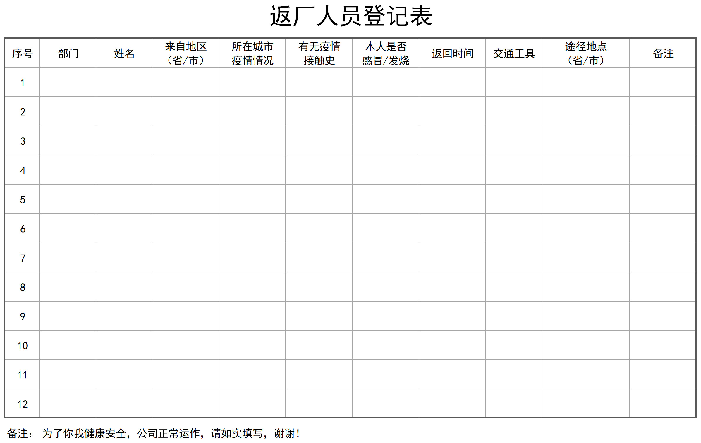 以上《返廠人員登記表》表格下載后支持自定義編輯,可視公司具體情況添補登記項,于企事業(yè)單位范圍內(nèi)對肺炎疫情進行科學的管理把控。