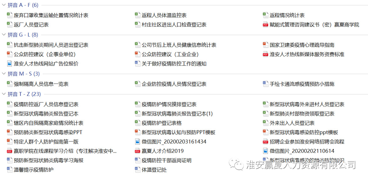 為盡綿薄之力,淮安贏夏人力資源有限公司為大家準備了企事業(yè)單位新型肺炎防控管理文檔【全套模板】。助力春節(jié)返工期少一些忙亂和隱患,添一份有序和安全。